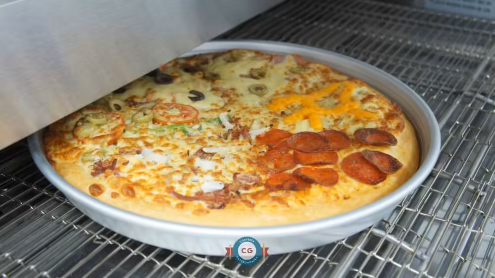 Em seguida ela é assada num forno especial, durante 9 minutos, na temperatura de 220Cº. O forno é uma cabine que tem uma esteira onde circula ar quente e faz o cozimento ser mais rápido e uniforme.