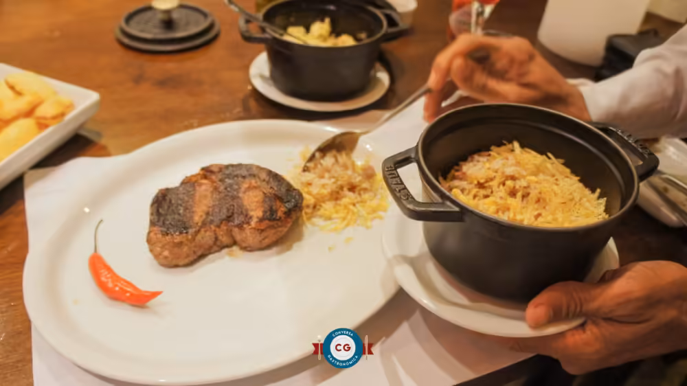 Entre os diversos acompanhamentos do restaurante, um dos que o chef me recomendou foi o arroz biro biro, que possui uma combinação de arroz branco com linguiça, cebola, salsinha, ovos cozidos picados e batata palha. A porção é bem generosa, e assim como nos outros pratos, serve bem mais de uma pessoa.